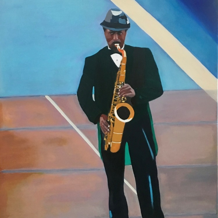 -Ofte maler jeg detaljerede New Yorker malerier, men til CPH Art Space har jeg arbejdet på at skabe en ny perlerække af værker. Malerierne er stærke i udtrykket, og manden som spiller musik på gaden for publikum er i fokus. Hvide diagonale streger fra vejbanen går igen. Den hvide streg er blevet den hvide tråd – der guider en rundt i værkerne”, forklarer Inge Nygaard.