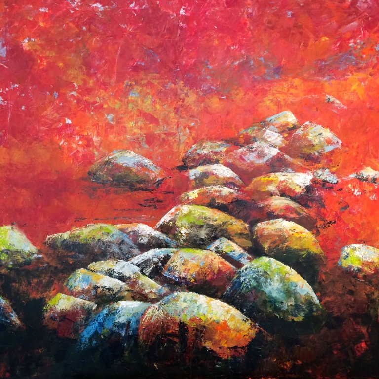 – For mig er det at male en nødvendighed – og det er en uudtømmelig kilde.. Jeg har ikke noget ønske om at komme i en speciel boks (hende der maler sten…) så jeg svinger fortsat med penslerne i alle retninger – og den seneste tid er jeg begyndt at male blomster. Her går jeg tæt på, leger med flydende farve og overlader dermed lidt af maleriet til tilfældigheder … en skøn og legende måde at male på, siger Inger Bennigsen.