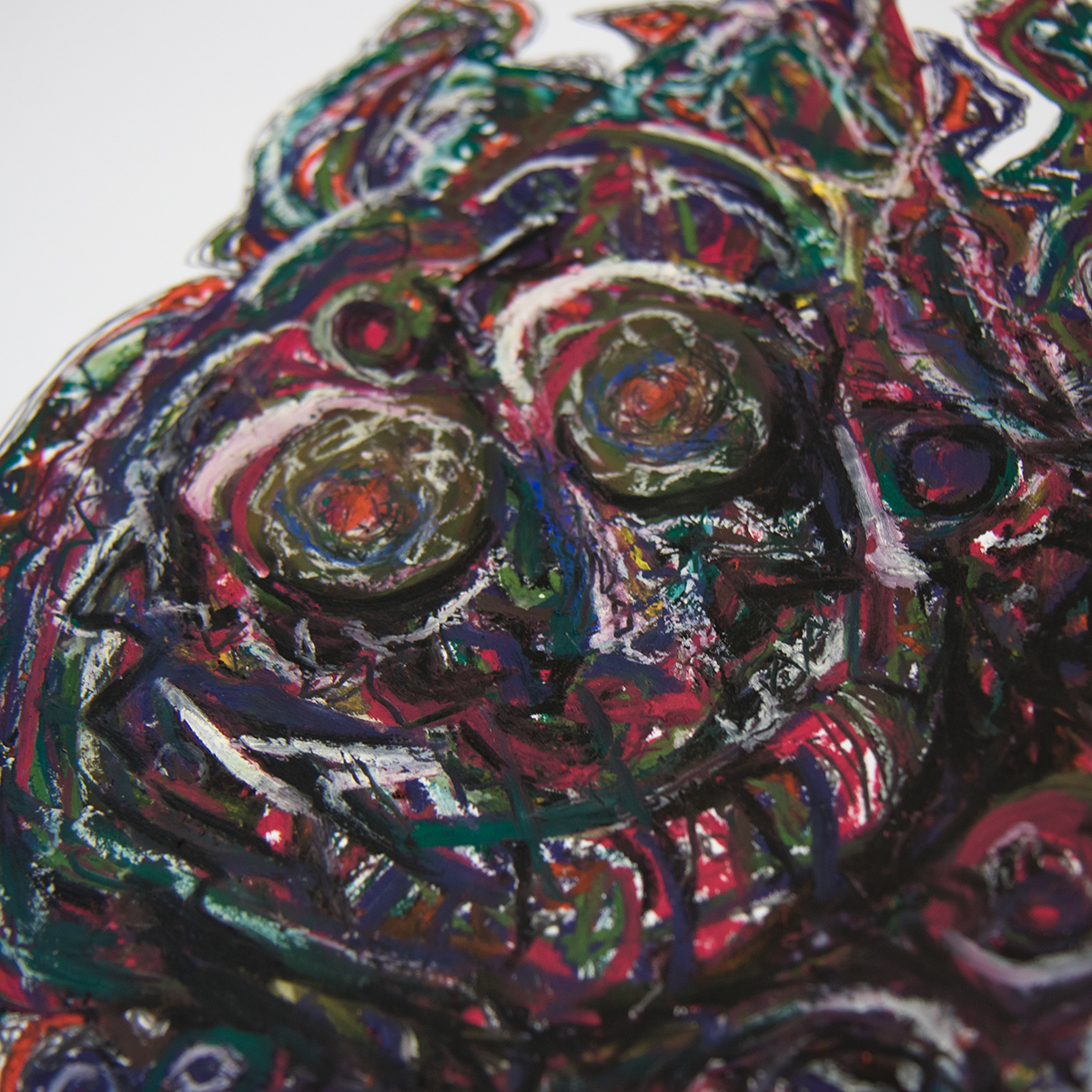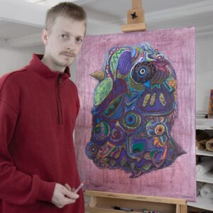 Jeppe Asholt (1991) arbejder med en praksis inden for ekspressiv surrealisme, hvor det uregerlige og det overnaturlige bliver vakt til live. I værkerne anvender han hovedsageligt materialerne oliepastel, kridt og blyant.