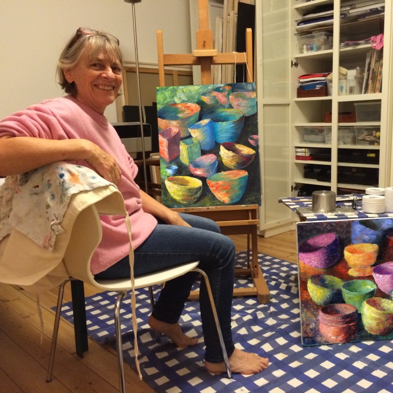 Farver betager mig. Jeg nyder hvert et malerstrøg og fascineres af farvernes indbyrdes spil. Jeg elsker NATUR, ikke de trimmede haver, men det uordnede, LYSET i træerne, de langstrakte enge, lange græsstrå, bløde linier. En gang imellem har jeg malet en skål, og så flere skåle. For tiden er SKÅLE blevet min passion.