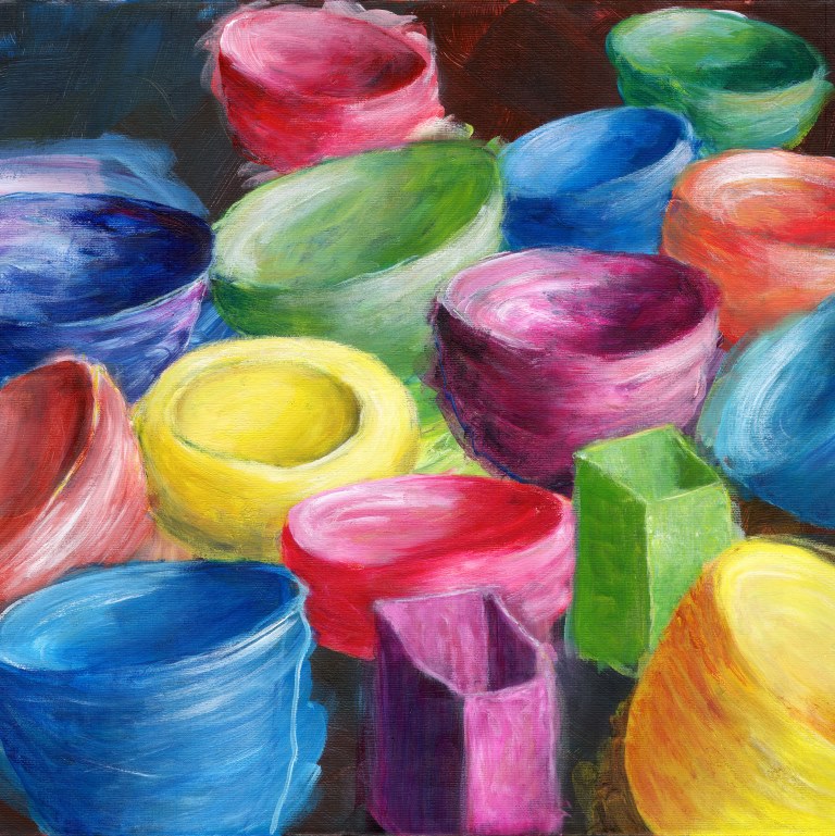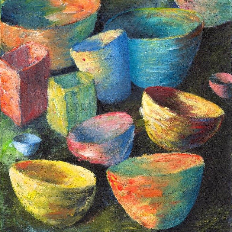 Skåle-motiverne giver mig stor frihed til at lege med farverne. For hvert maleri kan jeg frit vælge et nyt sæt af farver eller fortsætte med et kendt sæt af farver. Skålene er figurative med detaljer i lys og skygge, men de giver også muligheder for abstraktion. Jeg elsker at male til musik, med mig selv som kor.