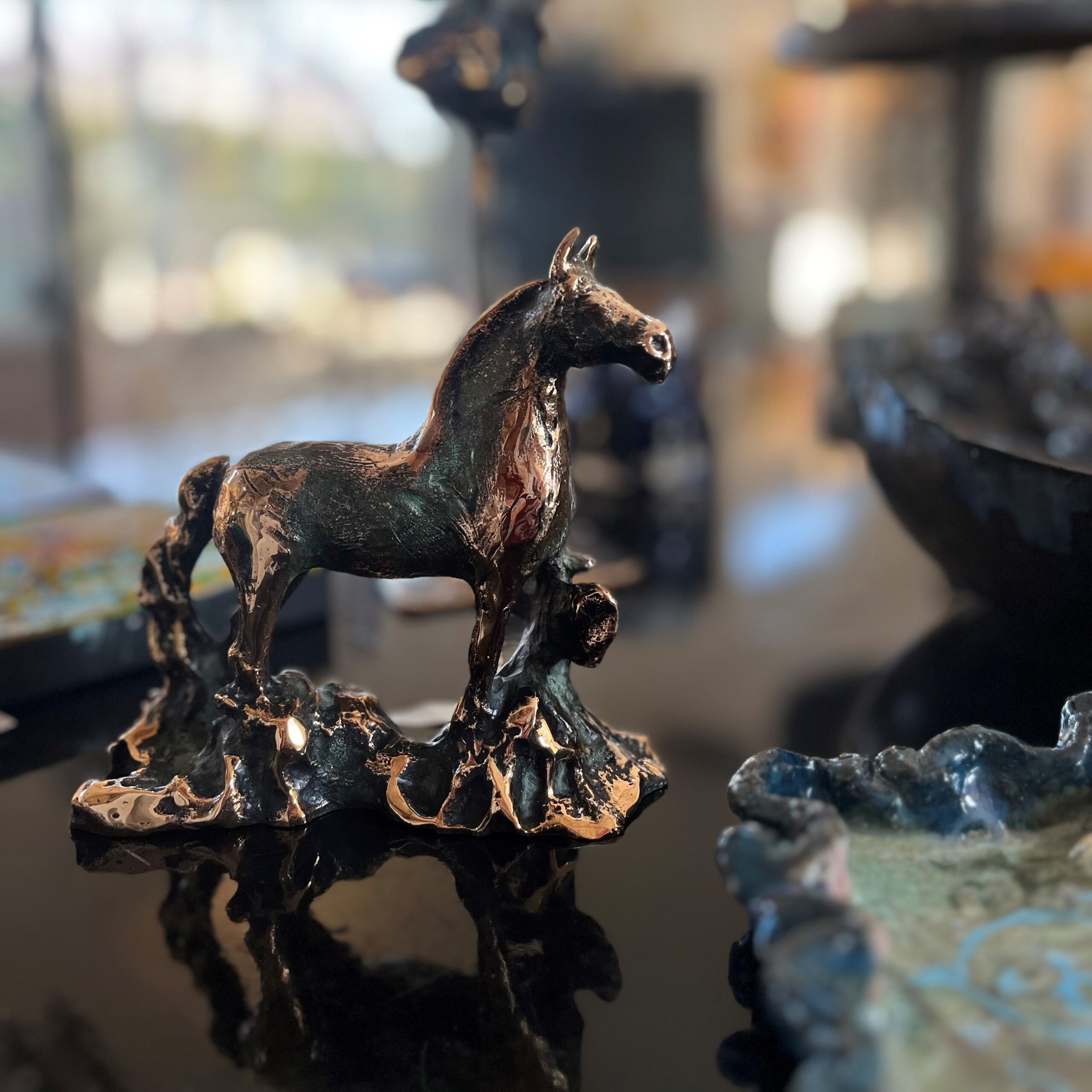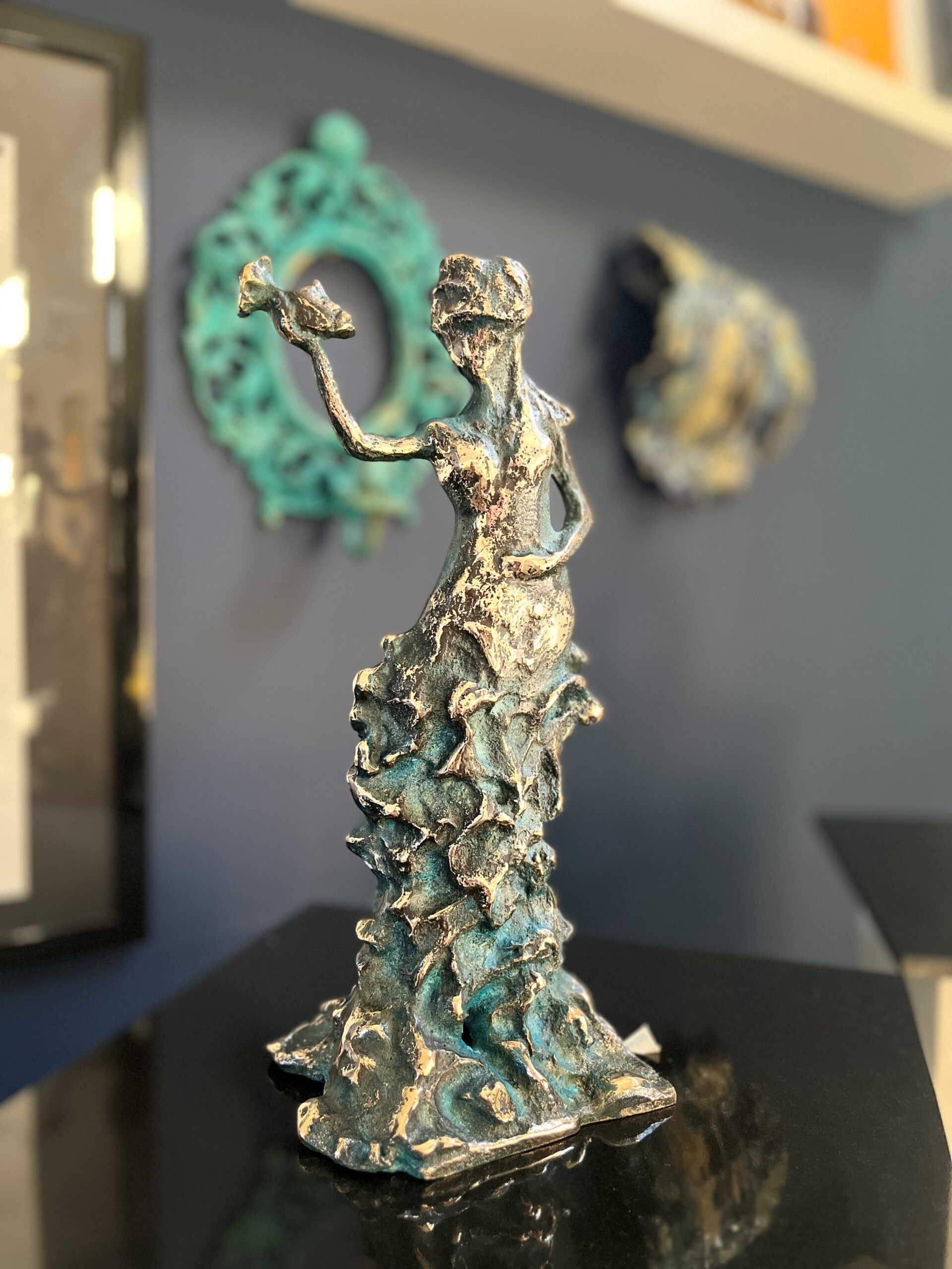 Jeg er kendt for de mange lag og materialer fra naturen i malerierne, de massive unika bronzerne er både kvinder, par, men også mine berømte heste, mange kender de fine hjertekloder som også er i massiv bronze og med bla. en smuk blå farve, bemærk kun 1 stk af hver..