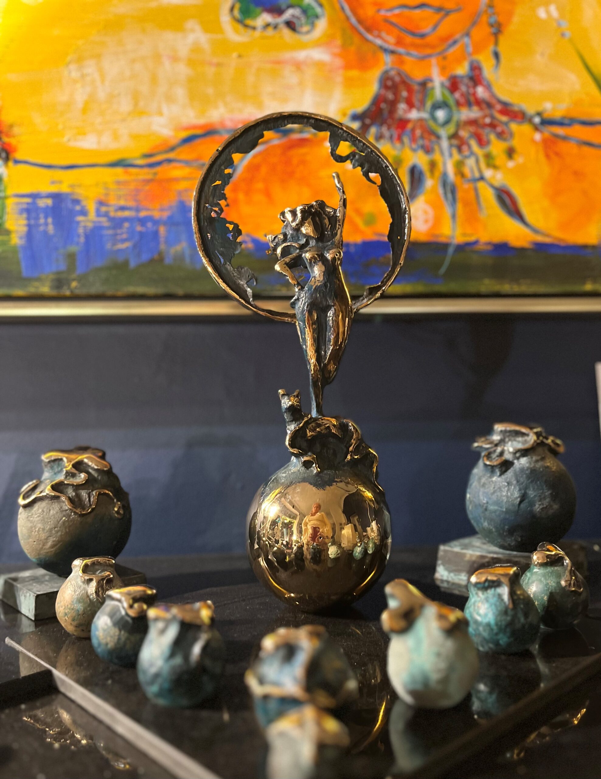 Kvinderne symboliserer Jorden, det store hår er en trækrone, hvor der er masser af dyr, fugle og insekter. Jeg har været kunstnerinde i hele mit liv har solgt og udstillet min kunst i over 35 år fra USA til Tahiti. Alle de viste værker er skabt i mit store eventyr atelier og bronze støberi på Æbleblomst Gård i Allerød.