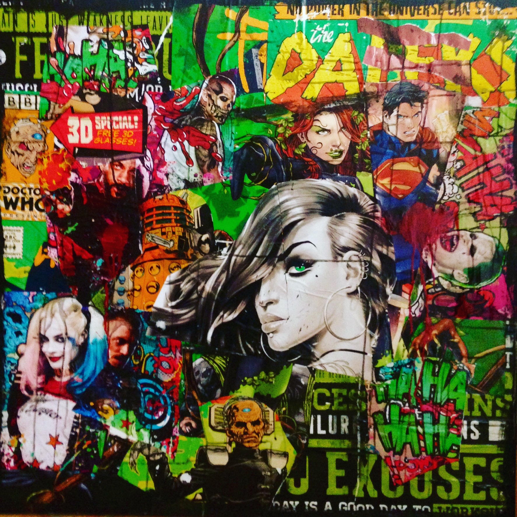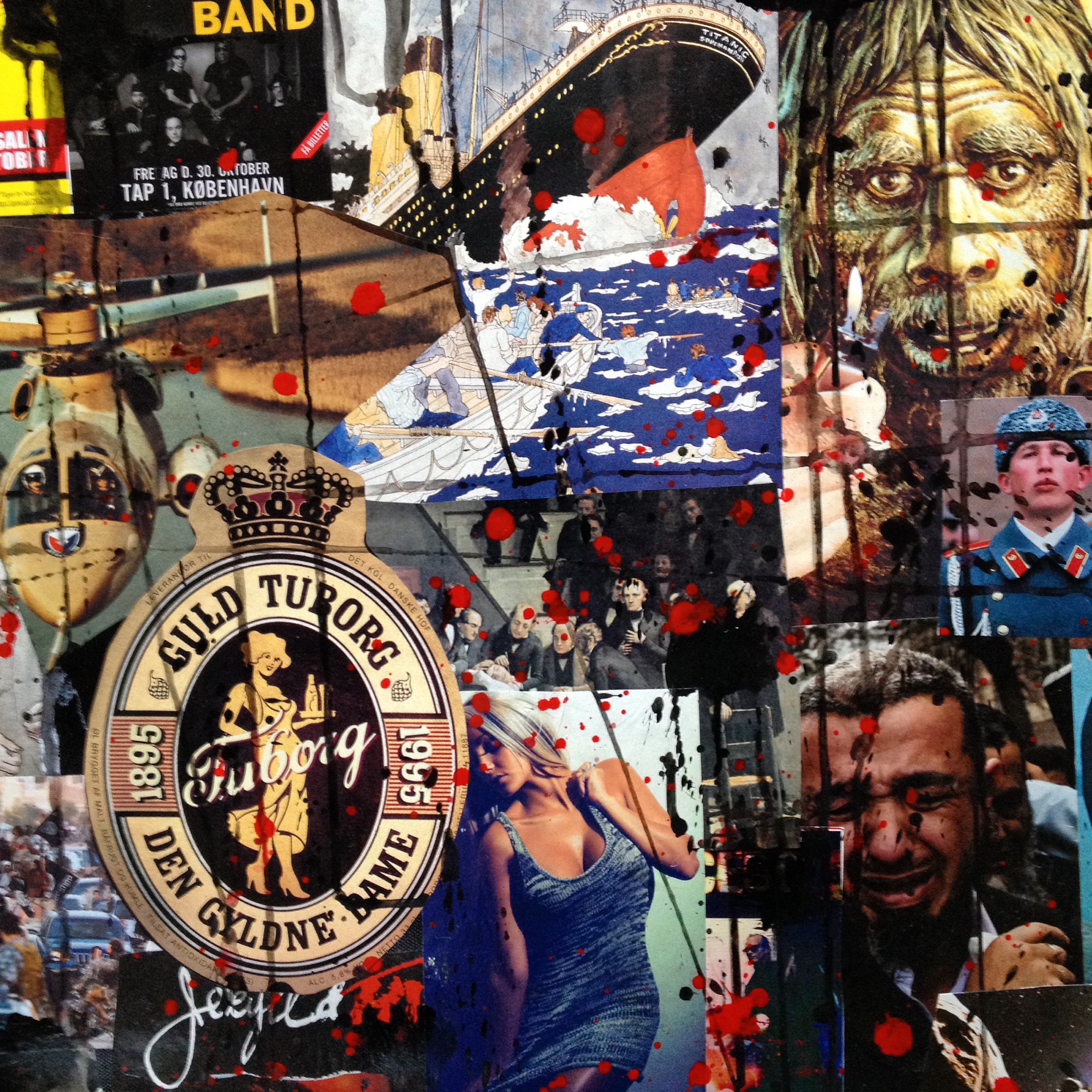 – Collagen dukker frem i et “trial and error” forløb, hvor nye sammensætninger afprøves og det kan tage lang tid inden det ønskede resultat opnås, såvel med hensyn til motiv som med farver. Når sammensætningen er på plads, kommer selve opsætningen på underlaget og derefter en anden vigtig del af processen. Nemlig “drip painting” af kollagen med akryl – primært i sort og rødt. Til sidst lakeres det færdige billede med sprayfernis eller limlak, fortæller Preben Saxild.