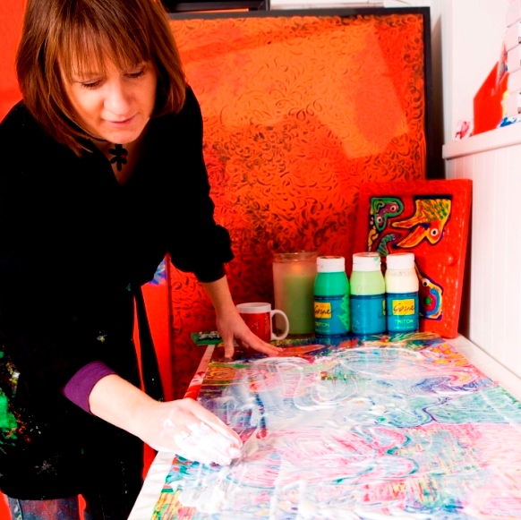 -Jeg pendler mellem at skabe værker i akrylmaling og mosaik. Jeg er meget taktil, har brug for at mærke materialerne i mine hænder – materialer som pirrer min sanselighed. Det er som to verdener, hvor jeg til stadighed stræber efter at smelte materialerne sammen til et originalt udtryk af former og farver. At finde en metode der er unikt, siger Sara.